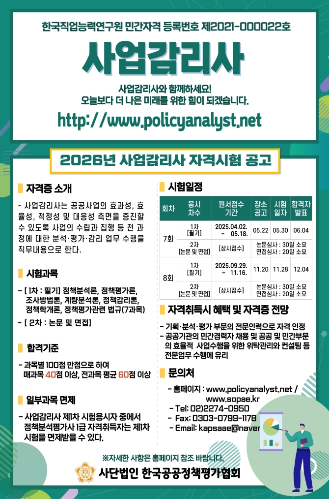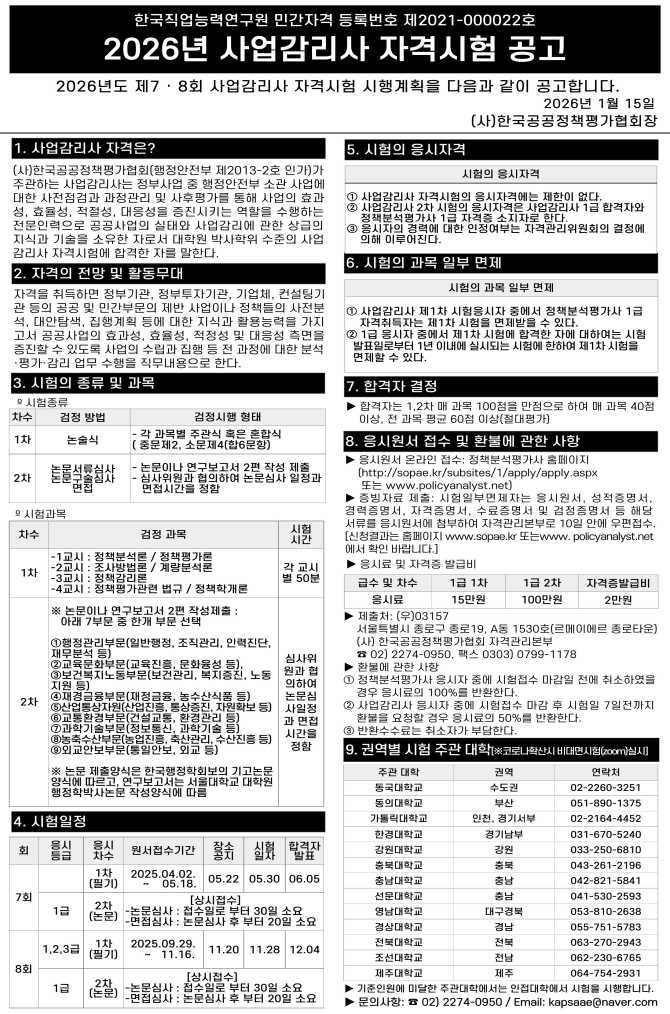 한국공공정책평가협회 자격관리위원회에서 2026년 제7, 8회 사업감리사 자격검정 시험일정을 공지합니다.